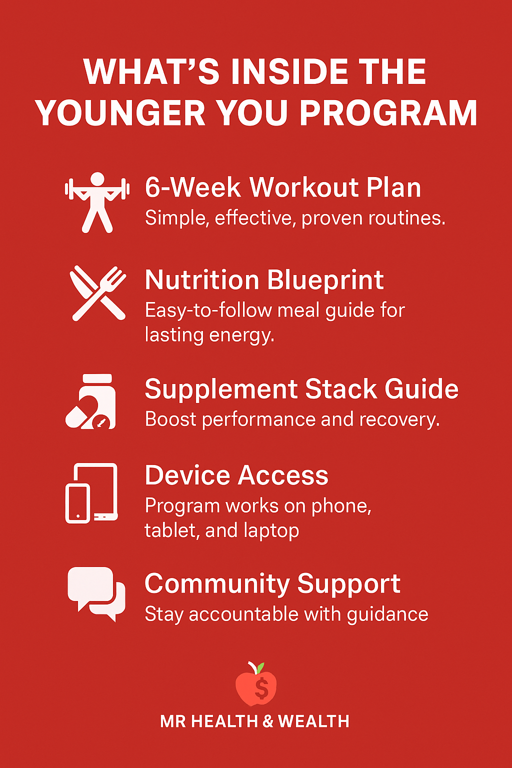 The Younger You Program gives you a structured 6-week workout plan designed to be simple, effective, and proven to work. Every move is chosen to build strength, improve endurance, and help you look and feel your absolute best no guesswork needed.